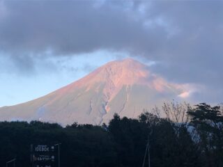 空には雲がいっぱいの中で、 富士山が夕日で明るい。