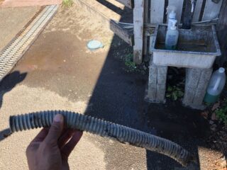 調べると、手洗いの排水ホースがダメになって、排水が外に漏れだしておりました。