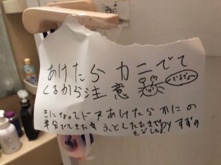 風呂場のノブに「開けたらカニが出てくるから注意(でるよ~)気になってドア開けたらカニの半分が出てきた☆ふとんたたきでもどした」と