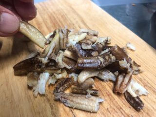 50本ほどのカニの足を、すりこぎでグリッとして肉をとりだす。