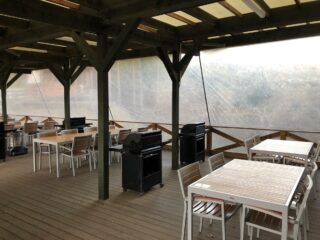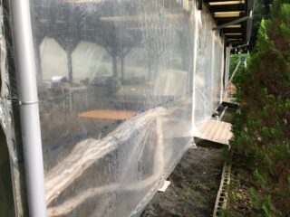森の隠れ家のお留守番をしながら、BBQ会場全体を覆う「風よけビニール」を張る作業をする。