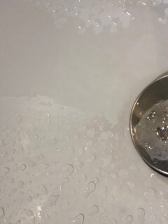 ミネラルが多く溶け込んでいますから、はねた水が乾くと、白く水垢が残りやすい。(鏡なんか特に)