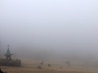 まさかのものすごいキリに包まれた、羊の放牧場。