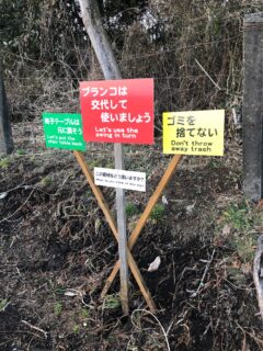描いてあることは「ブランコは交代して使いましょう」「イステーブルを使ったら戻そう」「ゴミを捨てない」。