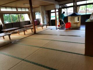 超早朝、お客様が見える前に、畳の休憩所をお掃除するスズキさん。