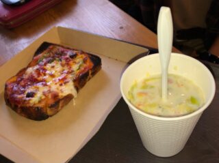 月曜日、雨の中で、サイトウお姉さんが「リオちゃんがドはまり大絶賛のシライシお姉さんの手作りクラムチャウダー(&ピザトースト)を食べに来ました~♬」と