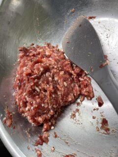 シカ肉は、脂肪が少なく食感がパサついてしまうので豚肉も混ぜ込みつつ、