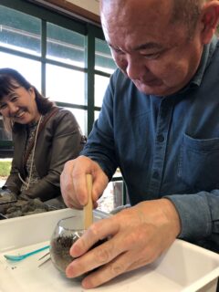 奥の部屋では、苔のテラリウム作りに真剣に取り組むお父様が