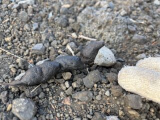 カラマツの葉が完全には落ち切らず、カラマツヒラタハバチという虫の卵も視認できます。(軍手指先の茶色い点々が卵)