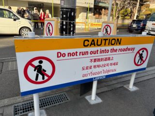 コンビニ前は、地面の表示・自主的に出した看板・公的な看板・POP・常に一人見える安全管理のおじさんなどなど、にぎやかな状態。