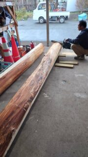 牧場内のヒノキを切り出し、4メーターちょいの長さの丸太にしてから