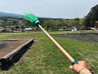 手作りホウキ2本と、買ってきた大きな竹ぼうきと鉄の棒のホウキ。