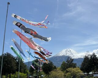 富士山西麓会の仲間、「もちや」さんのコイノボリで、富士山と撮る。