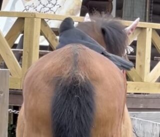 と、背中に乗って毛を何度も持ってゆく カラスのお母さん。
