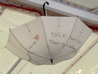 お客様の通る頭上だったので、糞受けとしてカサをつけて、表示も簡単に描いとく。