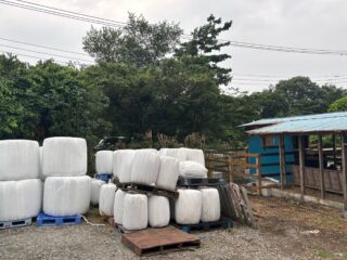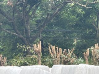 今、羊の家の横、一番大きい子牛の屋根を作り中。