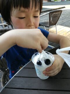 自分で採った、採りたてブルーベリーをソフトクリームに載せるという