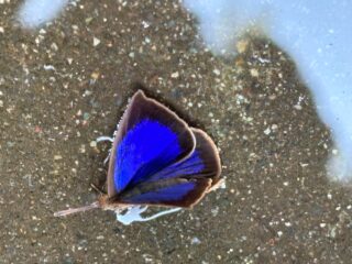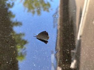 水たまりに落ちて、チョウが「このままじゃ死んじゃうぅ…」と弱り果てていた。