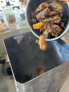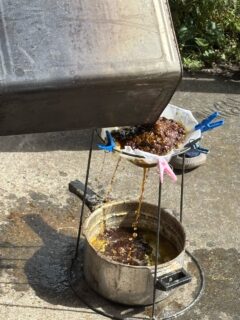 一斗缶のお湯が沸騰したので、中火にしてから搾りかすを放り込む、