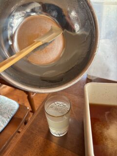 冷えると、下の水の表面に、板のようにミツロウがとれます。