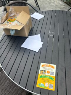 場内全てのテーブルや、目立つ部分に貼りまして、全部で約200枚ほどを貼り付けました。
