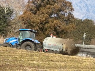 戻りがけに、イデボクさんで「スラリー(家畜糞尿の水分的な部分)」を散布しておりました。