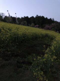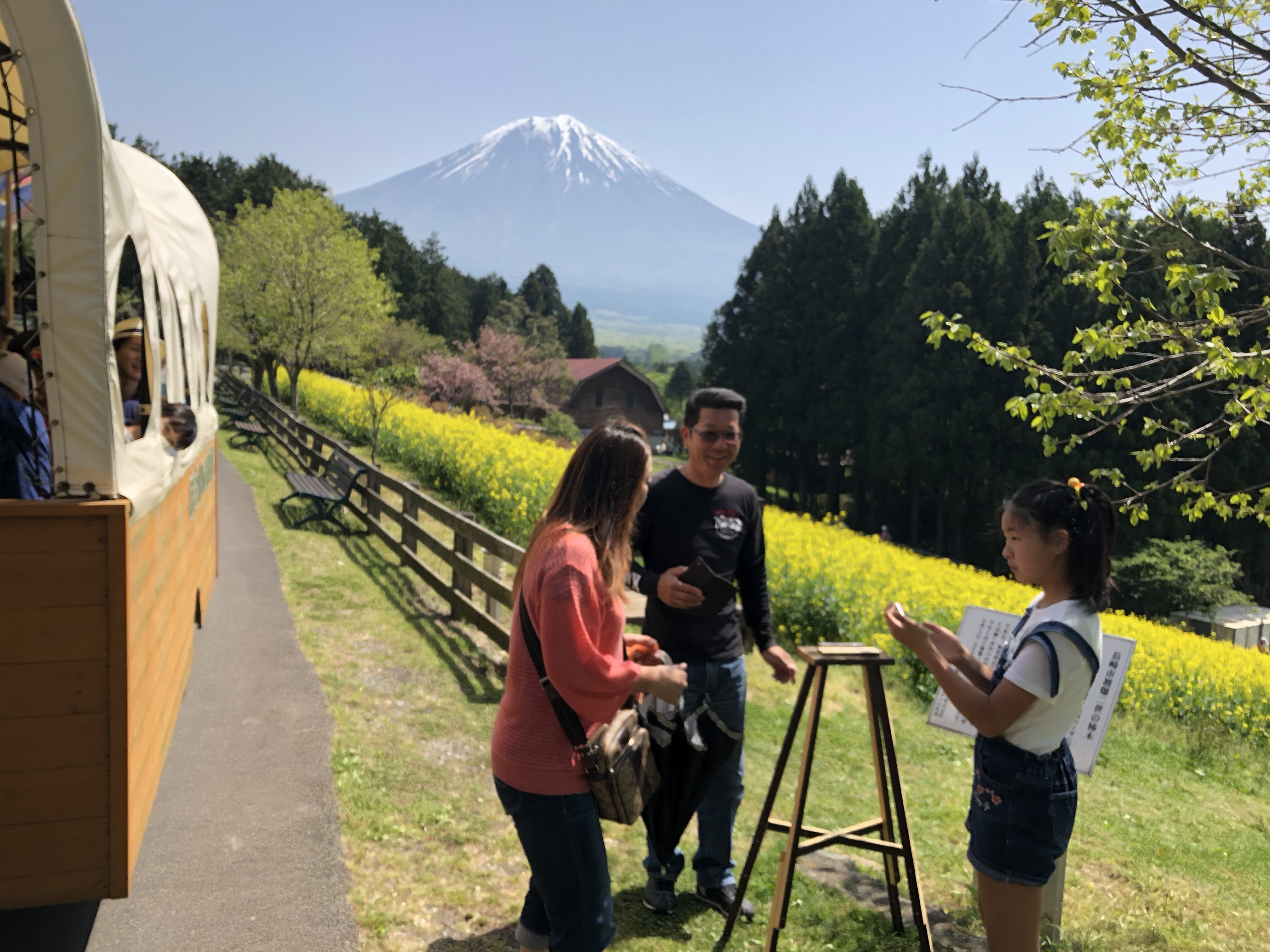 家族・菜の花・桜・富士山・青空が全部入る菜の花畑上の小さいテラスとカメラ台。