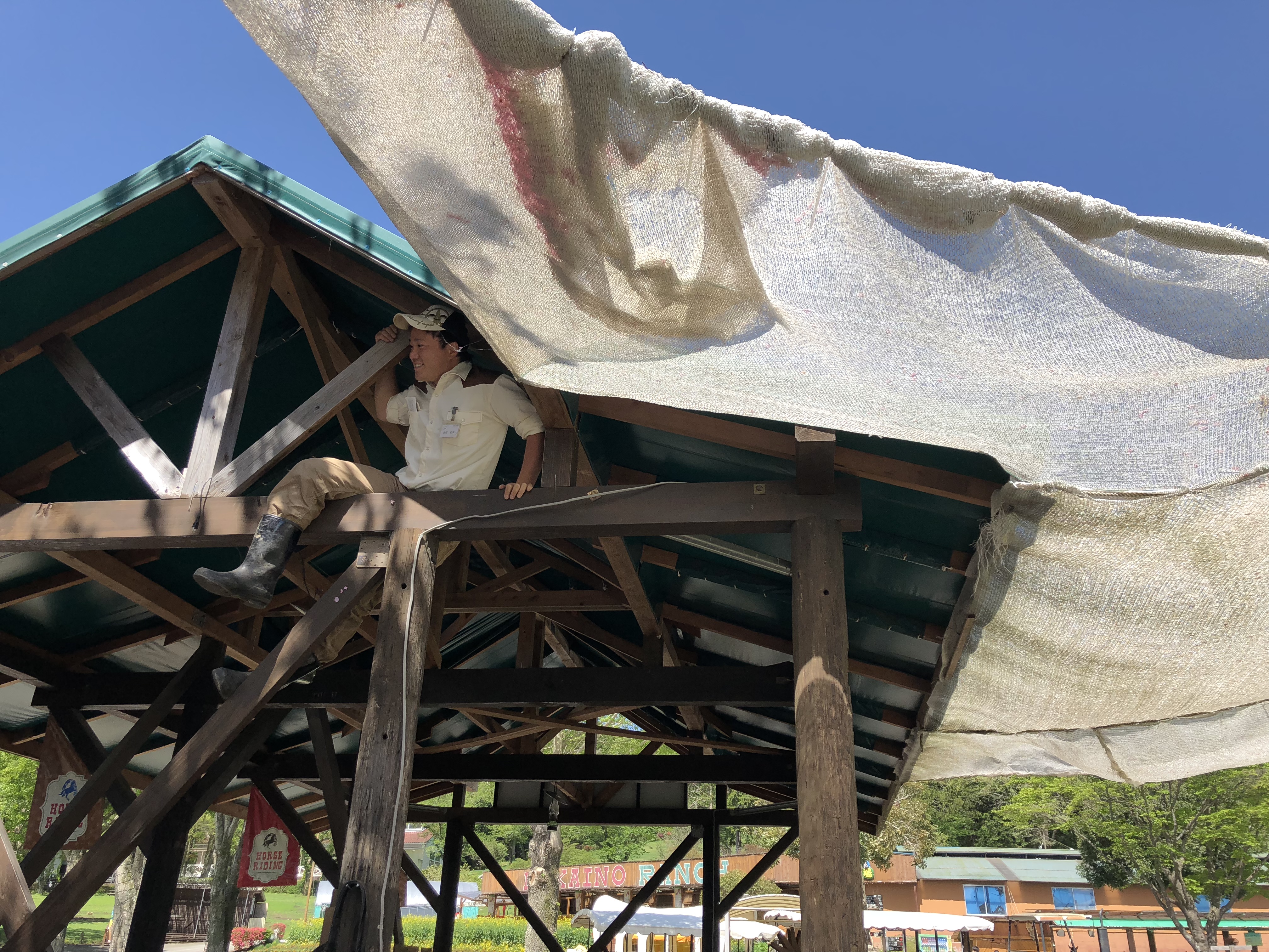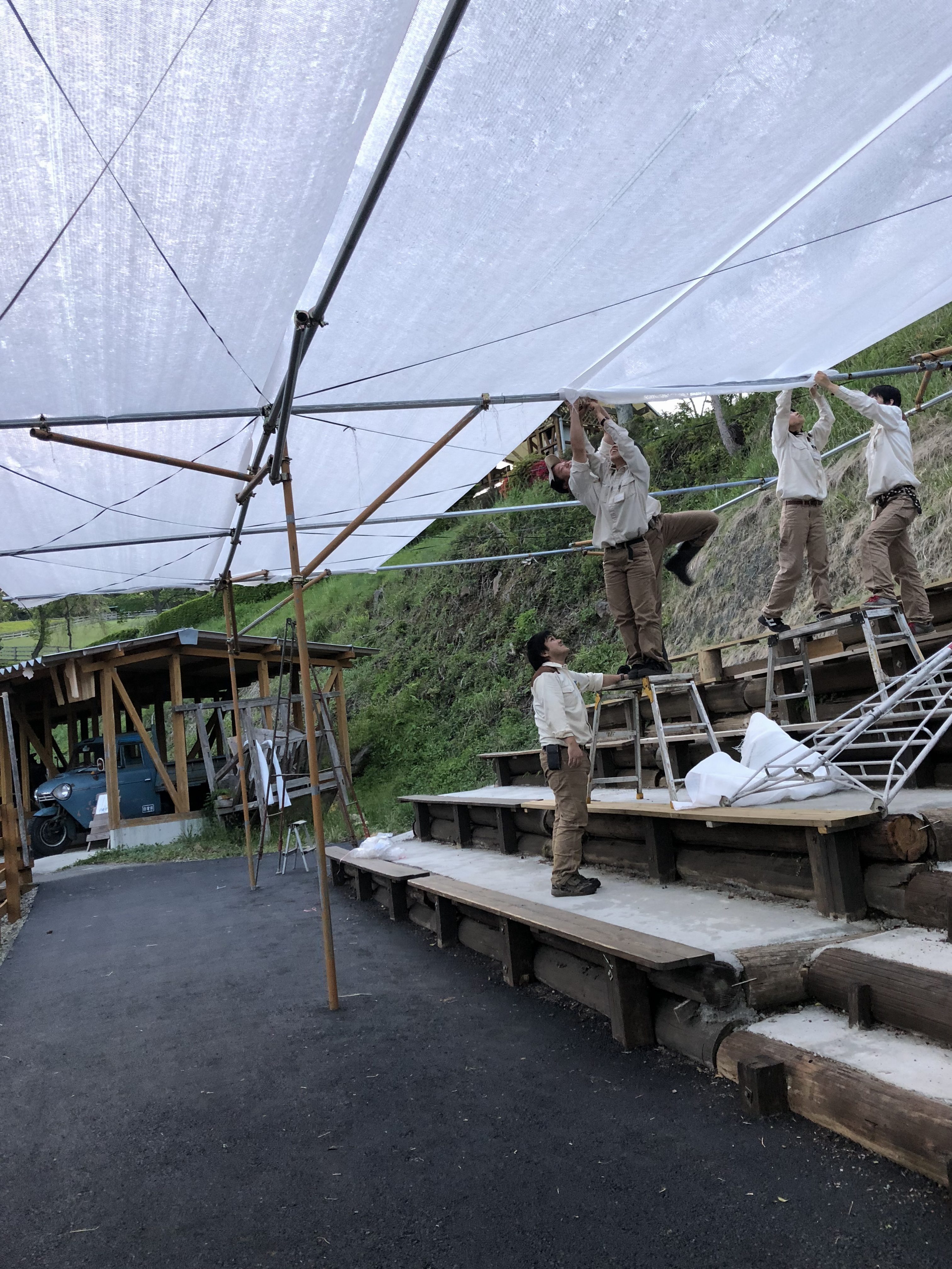 動物スタッフみんなで羊のかけっこ会場客席の寒冷紗張り。