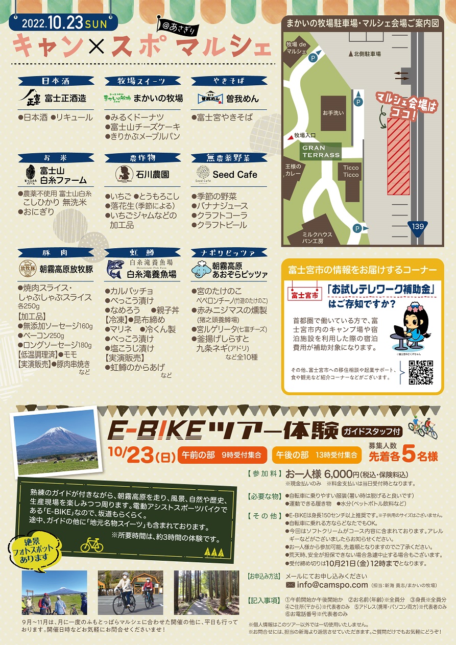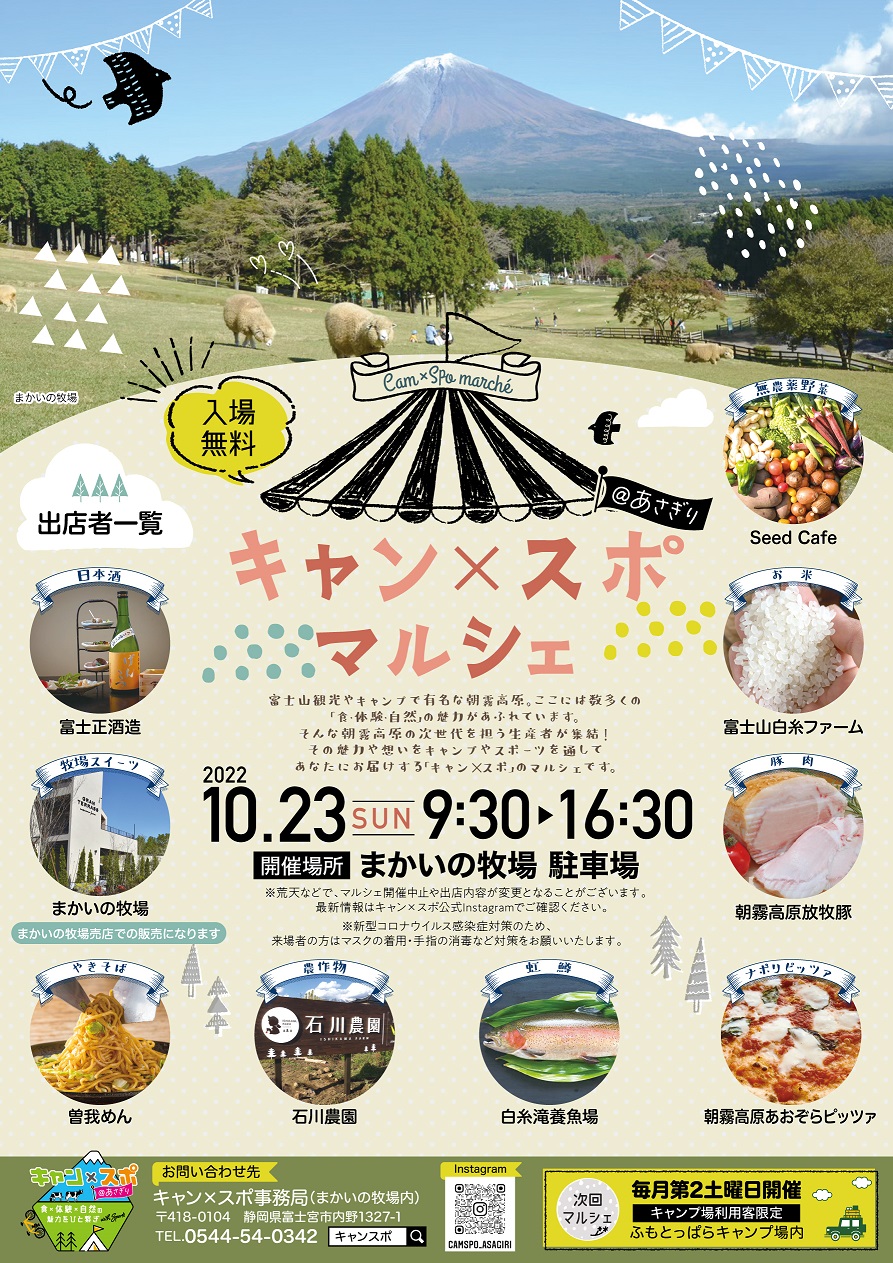 【10/23】キャン×スポ マルシェ開催のお知らせ 2022.10.02 イベント SHARE:まかいの牧場では、10月23日(日)にキャン×スポ マルシェを開催いたします! 富士山観光やキャンプで有名な朝霧高原。ここには数多くの「食・体験・自然」の魅力があふれています。 そんな朝霧高原の次世代を担う生産者が集結!その魅力や想いをキャンプやスポーツを通じてあなたにお届けする「キャン×スポ」のマルシェです。