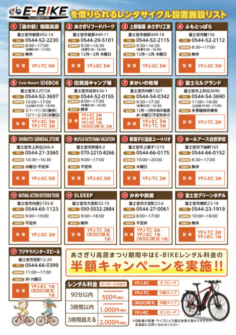 あさぎり高原まつり2024 2024.09.23 イベント SHARE:今年もあさぎり高原まつり実行委員会が主催のあさぎり高原まつりが10/1~31まで開催されます。 期間中はイーバイクの利用が半額になります! 是非まかいの牧場でご利用する場合は、ご予約ください。ご予約はコチラ