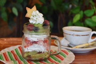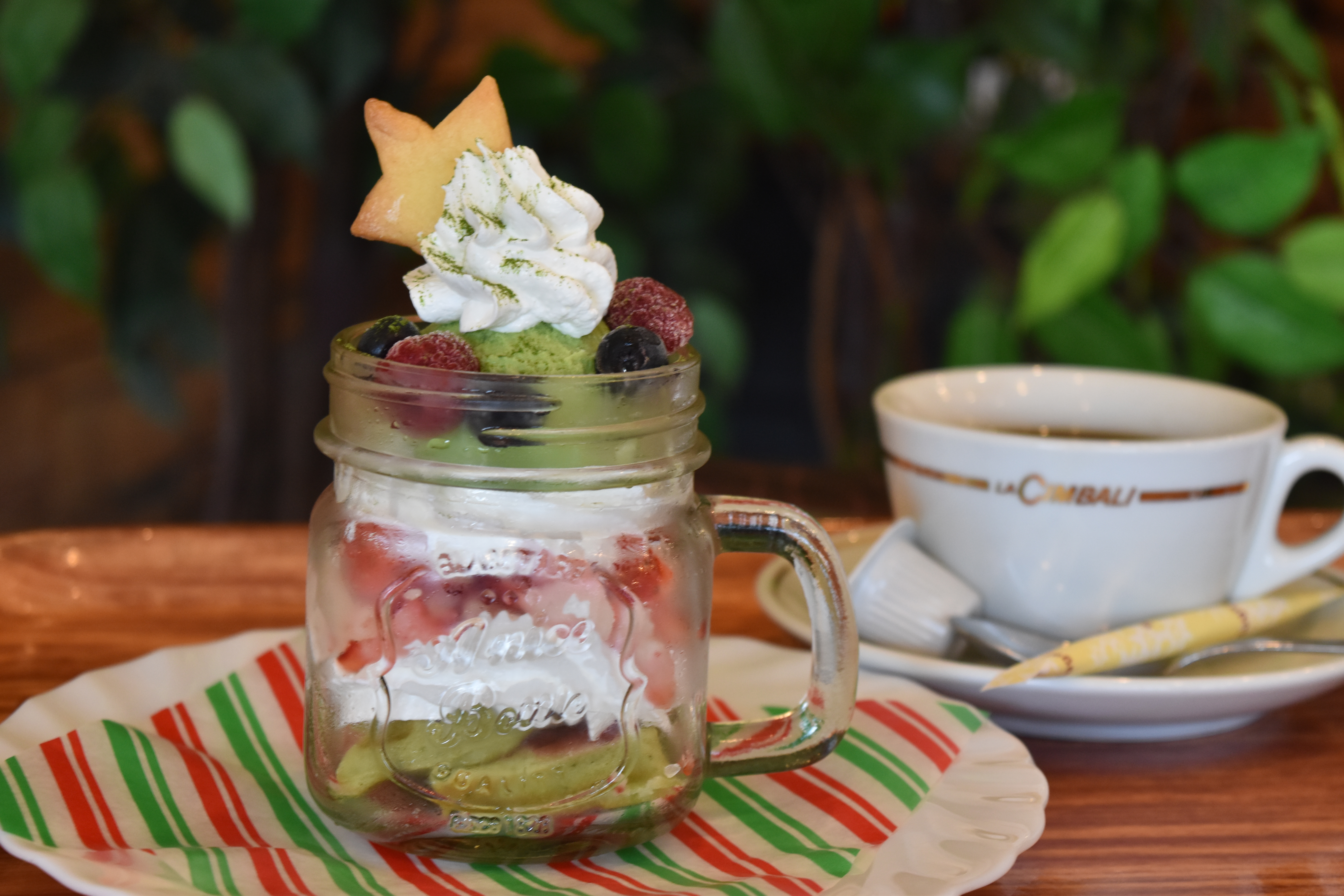 クリスマスツリーを意識した見た目にも可愛いジャーケーキ。ジェラートの味は選べます。12/25までの期間限定、800円。
