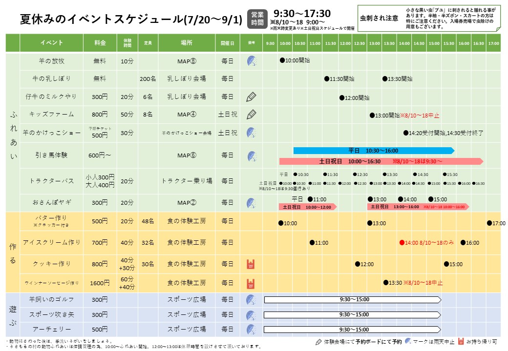 夏休みのイベントスケジュール(7/20~9/1)