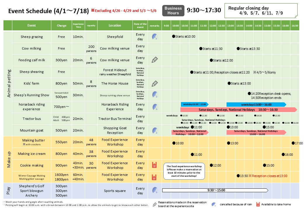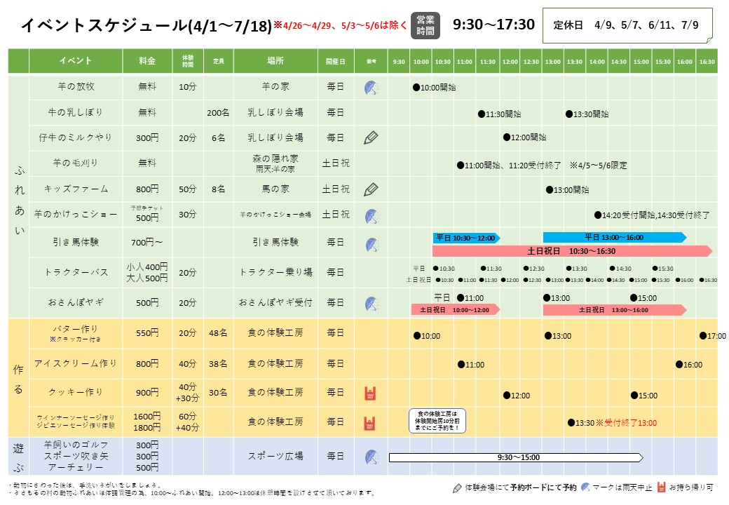 2025年4月1日~7月18日のイベントのタイムスケジュールです。印刷にはイベントスケジュール【こちら】(pdf)・English version(pdf)をご利用ください。