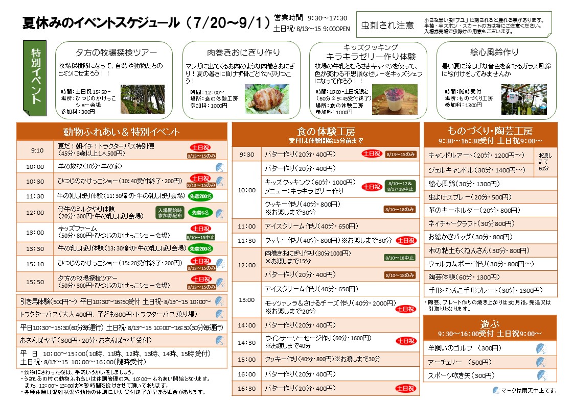 2019年夏休み(7/20~9/1)のイベントのタイムスケジュールです。印刷には場内でも配布しているイベントスケジュール【こちら】(pdf)をご利用ください。