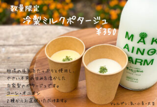 牧場の牛乳をたっぷりと使用した冷製ポタージュです。王道のコーンと甘さ引き立つオニオンの2種類からお選びいただけます。砂糖不要なので野菜本来の甘みをお楽しみいただけます。