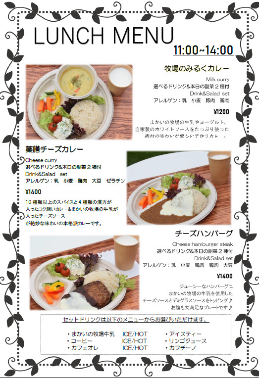 まかいの牧場の牛乳を使用したみるくカレーのセットや、チーズソースがたっぷりかかったハンバーグなど、お腹も大満足なメニューとなっております。テイクアウトもOK!是非お試しください!