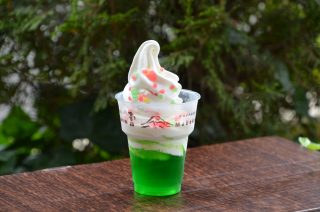 メロン味ゼリーの上に自家製ソフトクリームとカラフルなグミをトッピングした「山富士」