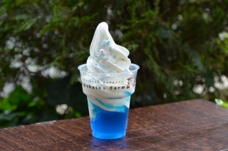 ソーダ味ゼリーの上に自家製ソフトクリームとパチパチキャンディーをトッピングした「富士山」