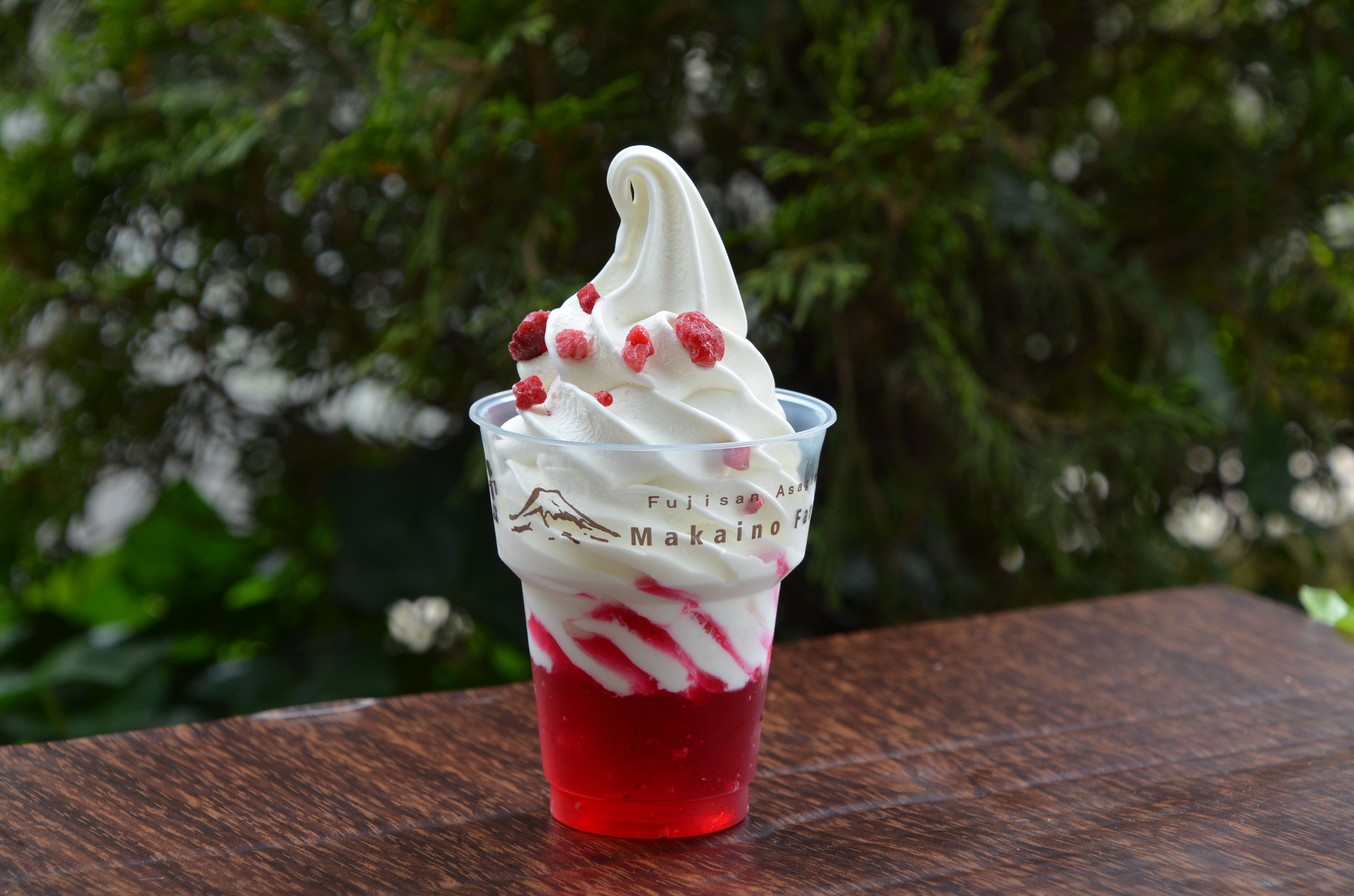 いちご味ゼリーの上に自家製ソフトクリームとラズベリーをトッピングした「赤富士」