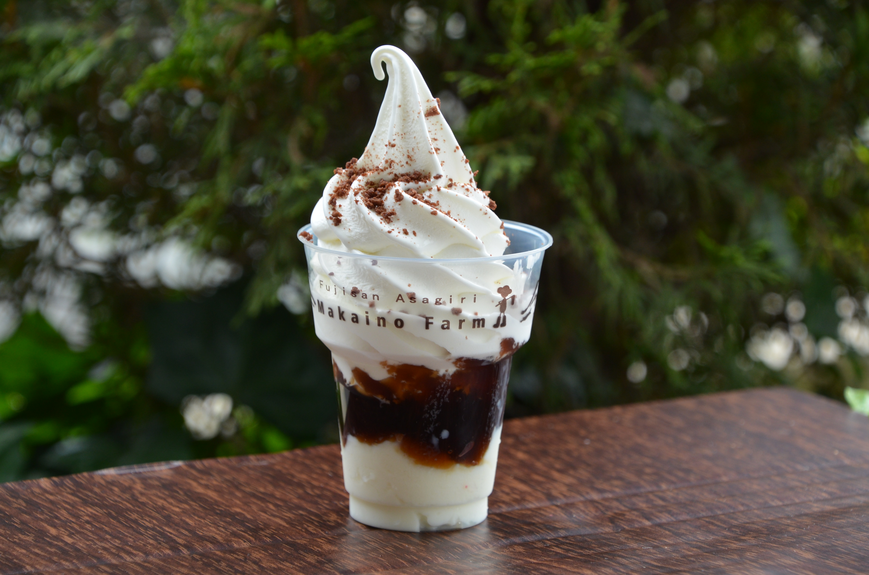 自家製ソフトクリームにココアビスケットを散りばめました。牛柄の中身は手作りパンナコッタとコーヒーゼリーです。