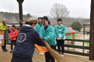 開催は営業時間中。新しくできた、ふれあい牧場のテラスで、先輩社員やマラ、お客様に見守られながらの入社式。式の途中ではお客様の温かな拍手もいただくことができ、緊張の面持ちで参加した新入社員たちも、たくさんのお客様と先輩羊の協力のおかげか、無事に式を終えることができました。