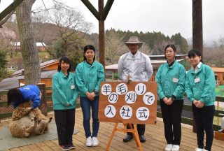 羊の毛刈りを迎えるこの時期、「思い出に残る式を」という先輩スタッフたちの声から生まれた、毛刈りの入社式。羊同様、学生から新社会人へと一皮むけてもらおうと、今年で5回目を迎えました。