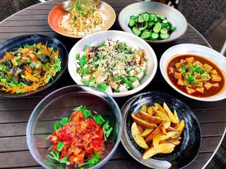 夏のメニューとして、和田とうふ屋さんのお豆腐を使用した、おとうふサラダ~赤じそ仕立て~をはじめ、麻婆豆腐、ナスとソーセージのカレー炒め、ツナとたくあんの冷製パスタ、レッドムーンのフライドポテト、はちみつとトマトのごまあえ等を提供しています。