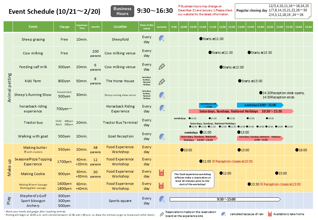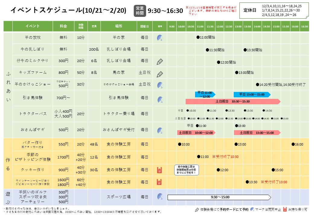 2025年10月21日~2026年2月20日のイベントのタイムスケジュールです。印刷にはイベントスケジュール【こちら】(pdf)English version(pdf)をご利用ください。