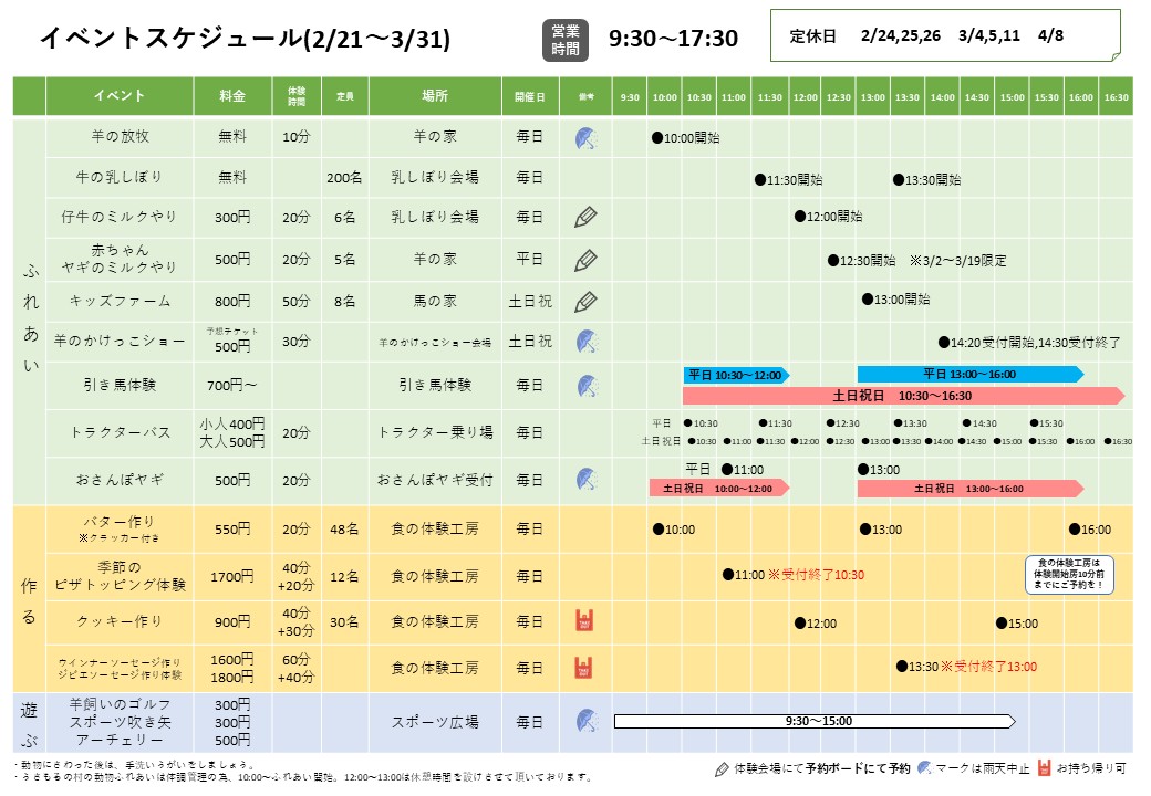 イベントスケジュール(2/21~3/31) 2026.02.15 イベント SHARE:2026年2月21日~2026年3月31日のイベントのタイムスケジュールです。印刷にはイベントスケジュール【こちら】(pdf)・English version(pdf)をご利用ください。