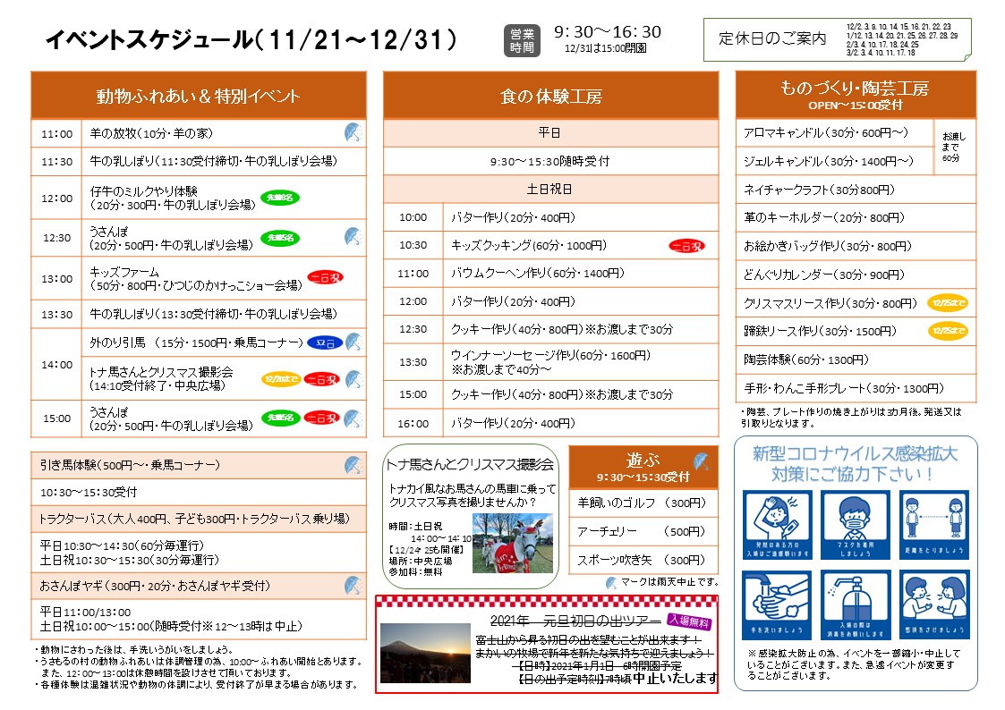 2020年11月21日~12月31日のイベントのタイムスケジュールです。印刷には場内でも配布しているイベントスケジュール【こちら】(pdf)をご利用ください。