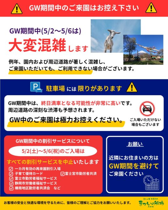 つきましては、混雑緩和および安全確保の観点から、GW期間中のご来園は極力お控えいただき、時期をずらしてのご利用をご検討くださいますよう、強くお願い申し上げます。