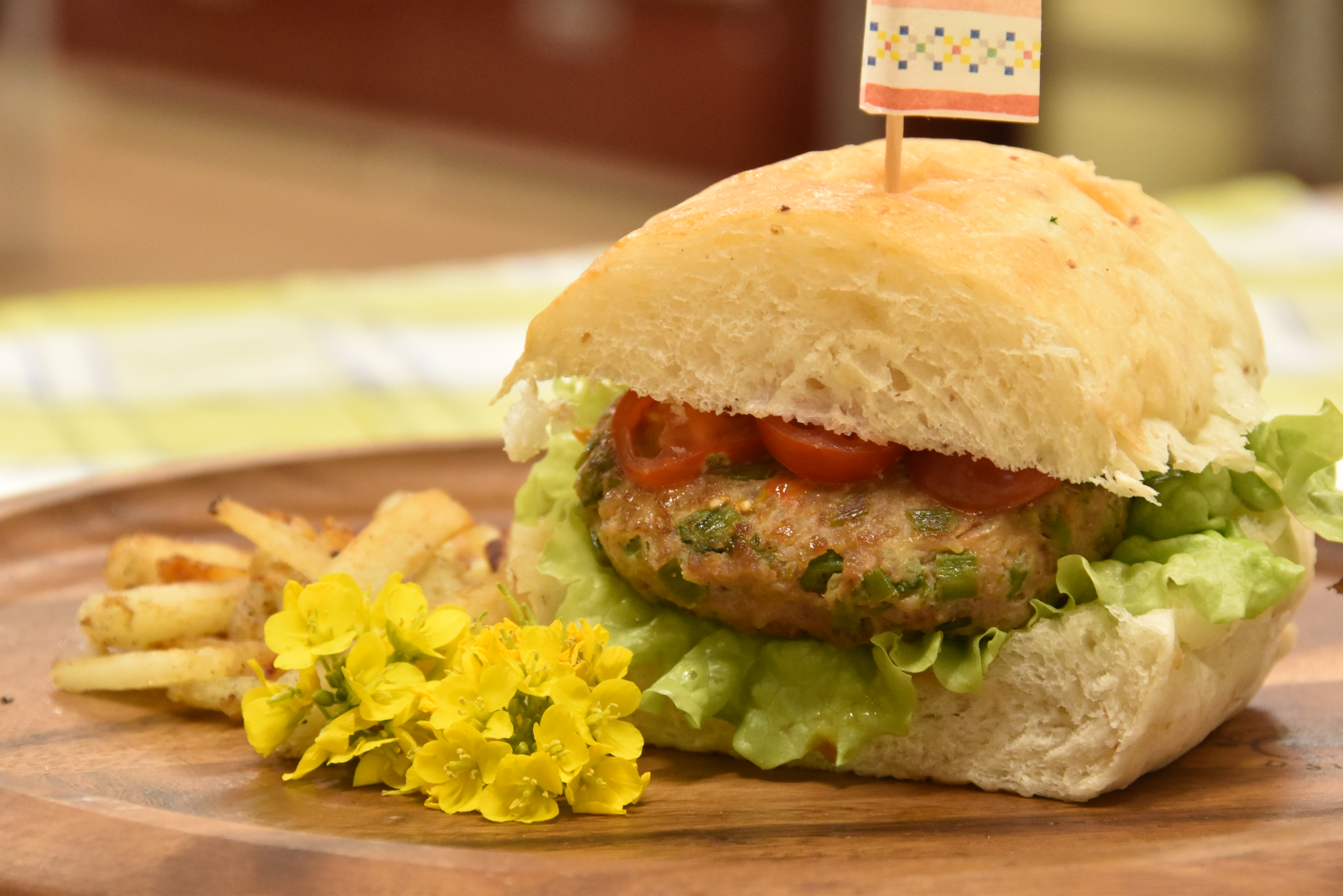 牧場で採れた菜の花を使って、春のハンバーガーを作りませんか。ピクニックにもピッタリです。