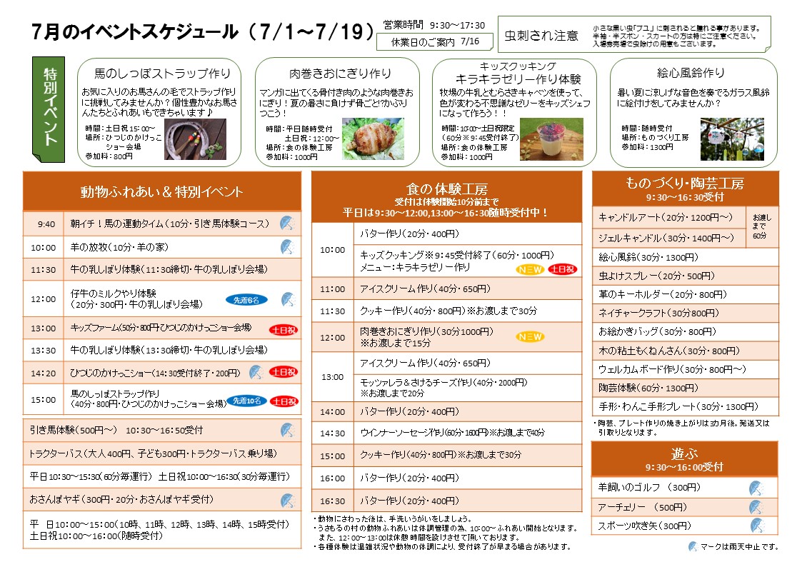 2019年7月(7/1~7/19)のイベントのタイムスケジュールです。印刷には場内でも配布しているイベントスケジュール【こちら】(pdf)をご利用ください。