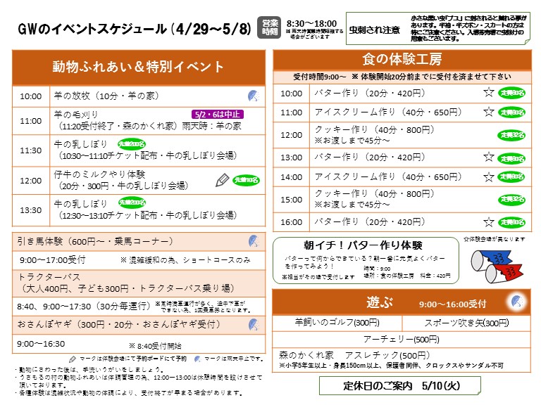 2022年4月29日~5月8日のイベントのタイムスケジュールです。印刷にはイベントスケジュール【こちら】(pdf)をご利用ください。